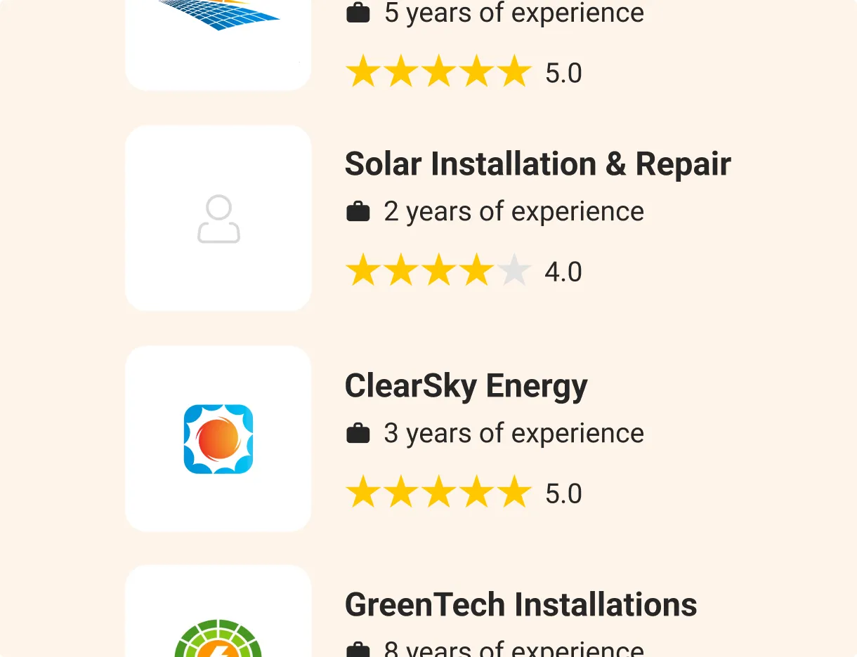 Contractors and firms across solar installation, roofing, electrical, and engineering.